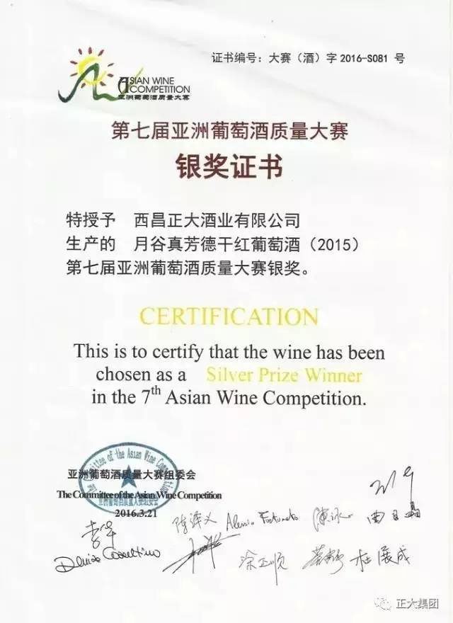 ▲正大酒業(yè)月谷干紅葡萄酒榮獲第七屆亞洲葡萄酒質(zhì)量大賽銀獎