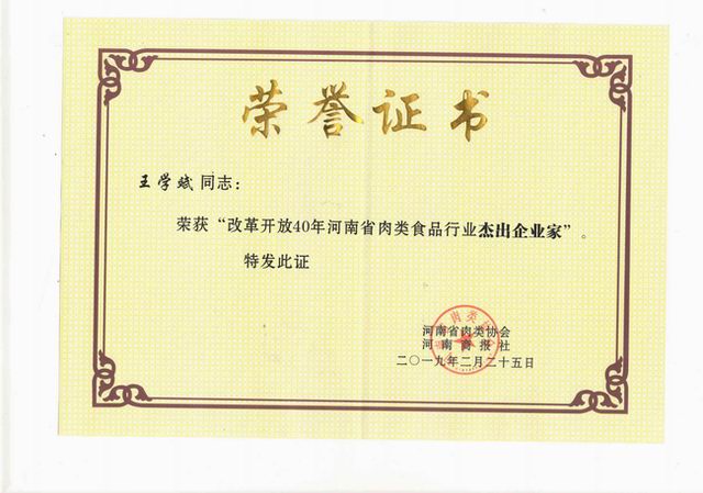 榮譽(yù)‖洛陽正大獲評(píng)改革開放40年河南肉類食品行業(yè)強(qiáng)勢(shì)企業(yè)、王學(xué)斌***總裁榮獲改革開放40年河南肉類食品行業(yè)杰出企業(yè)家