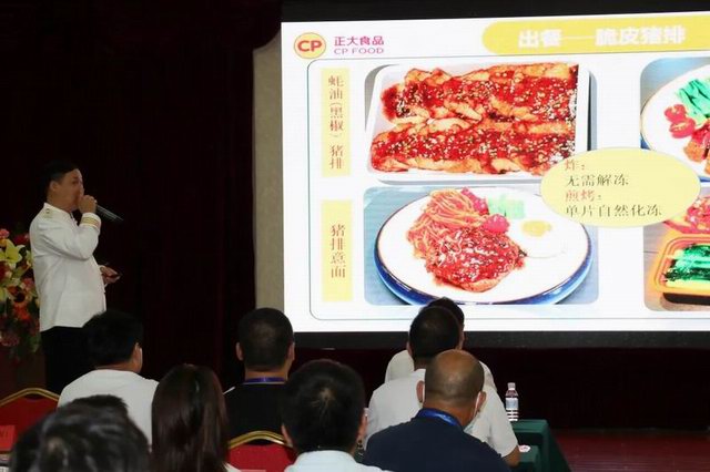 注冊中國烹飪大師、洛陽正大食品研發(fā)廚務(wù)總監(jiān)張立新先生向團(tuán)餐大會介紹了洛陽正大食品開發(fā)的十余款預(yù)制豬肉調(diào)理產(chǎn)品,并從后廚實操角度分享了產(chǎn)品特色和賣點,逐一介紹了出餐加工標(biāo)準(zhǔn)和配餐流程。