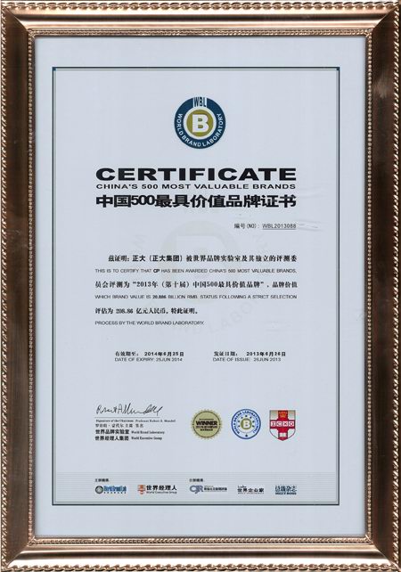 正大集團(tuán)榮膺“中國500***具價值品牌”